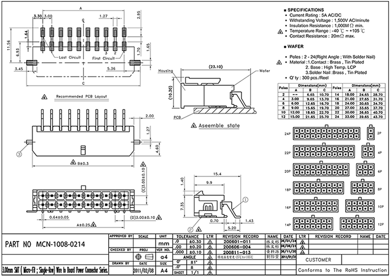 Wafer. 3.0mm, 2*10 Pins, 90 Deg., MicroFit, SMT